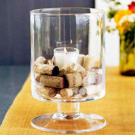 Be creative with your centerpieces using a vase, collected wine corks and a candle